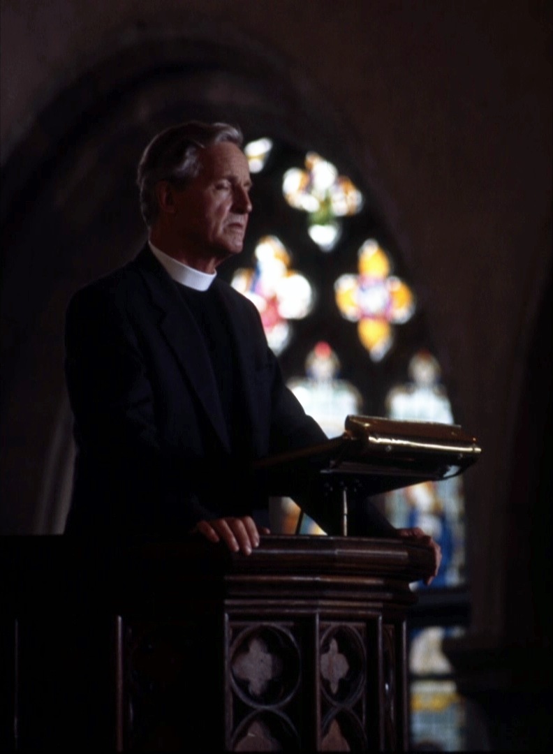 This moment is when the local vicar, brilliantly played by Nicholas Parsons (*insert rant here on how terribly annoyed I was as an adult to discover fans have mocked, *mocked*, his top tier guest starring ways*), stands in his pulpit, addressing an empty church. He recites the First Letter to the Corinthians, and falters, unable to finish. His faith had been challenged in an earlier scene: he’s not afraid of German bombs, but British bombs killing German children? That’s destroyed his belief, so say the vampires, anyway. And here he is, trying desperately to hold on to it, and failing. He accepts it’s gone, and that breaks him in a different way.